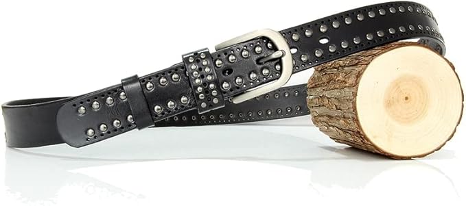 از جنس چرم مشکی با تزئینات میخ‌های فلزی کوچک ساخته شده است. این نوع کمربند با استایل خاص و خشن خود، معمولاً در استایل‌های گرانج، پانک و راک بسیار محبوب است. سگک فلزی نقره‌ای و میخ‌های فلزی برجسته روی بند کمربند، جلوه‌ای صنعتی و جذاب به آن بخشیده است. این کمربند می‌تواند به راحتی یک ظاهر ساده را به یک استایل متفاوت و متمایز تبدیل کند و برای انواع شلوارهای جین و بگ بسیار مناسب است.